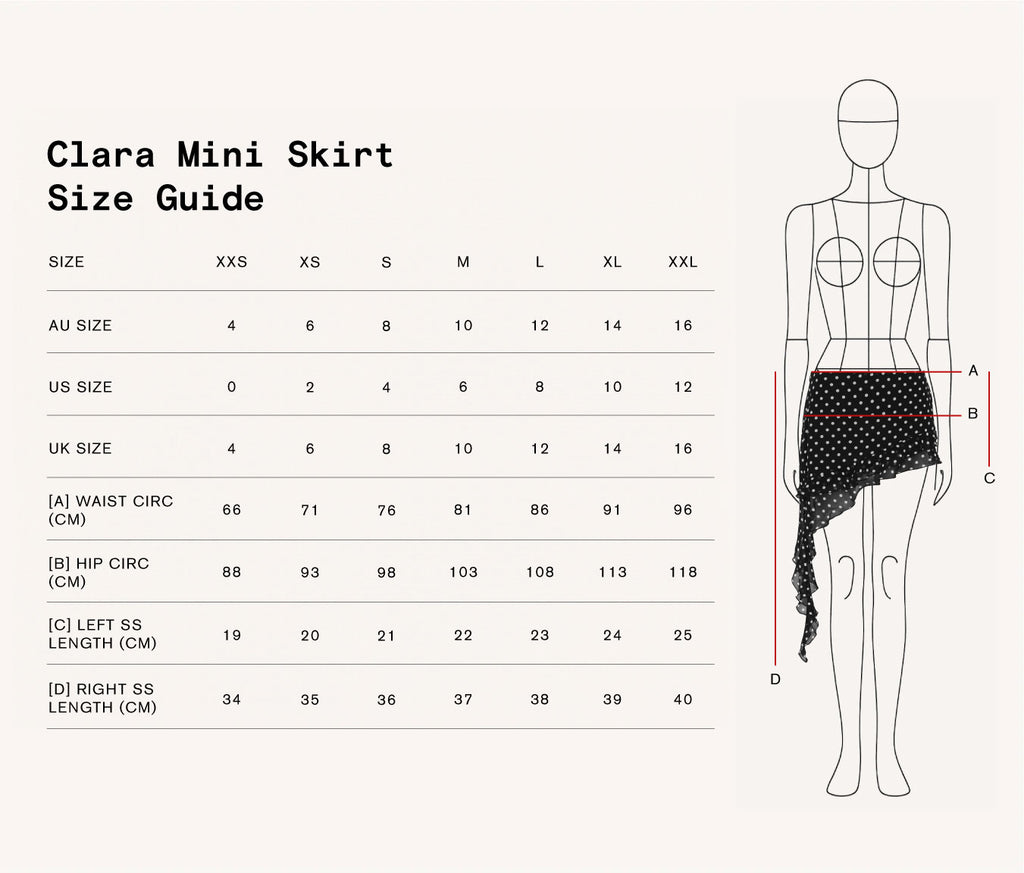 Flirtatious and feminine, the Clara Mini Skirt is cut from a soft, sheer chiffon in an all-over black polka dot. This statement piece features a playful asymmetric hemline finished with a cascading ruffle detail, adding movement and charm with every step. Designed to sit comfortably low on the waist, this lightweight mini is fully lined through the body with a sheer hem and tail for added dimension.