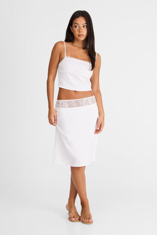 Angelic, feminime and delicate. The Fleur Top captures the spirit of ethereal romance. Crafted with a white lace detailing highlighted along the bust, into a beautiful lightweight satin that gently skims the body. The fine strap adds delicacy that shows off the décolletage.
